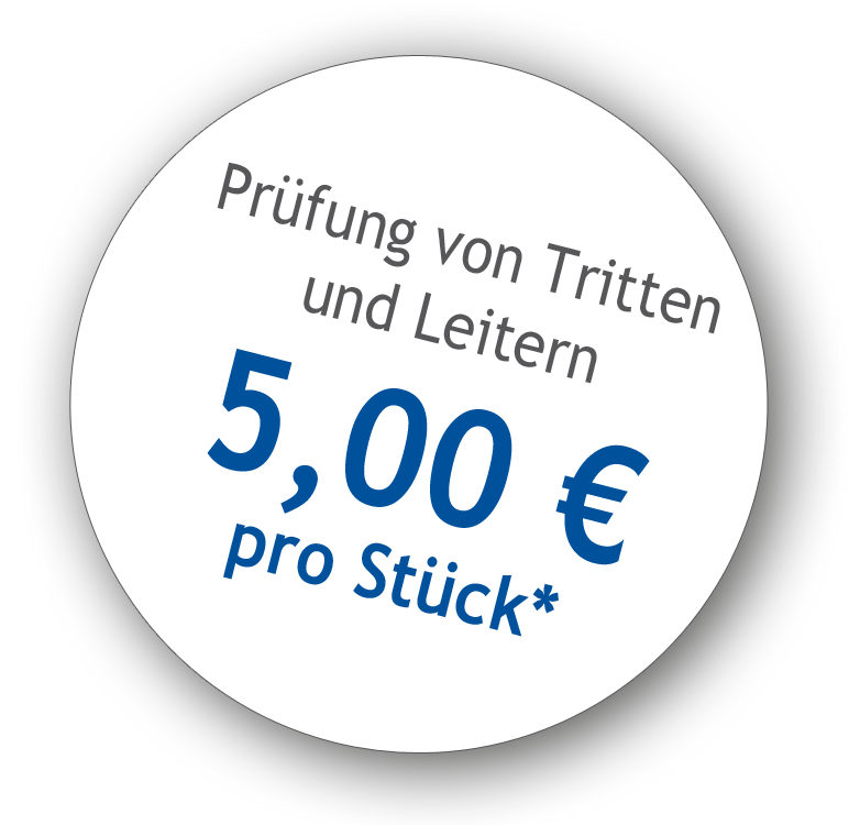 Im Preis enthalten ist die Prüfung gemäß DGUV 208-016 inkl. Prüfplakette. Betriebsanweisungsaufkleber gegen Aufpreis. Alle Preise zzgl. gesetzl. MwSt. Preise in Euro und gültig im Aktionszeitraum. Der Auftraggeber hat die Leitern/Tritte in gereinigtem Zustand an einem gut beleuchteten Platz zur Verfügung zu stellen, der die vollständige Aufstellung der Leitern und Tritte auf ebenem Boden möglich macht.Änderungen und Irrtum vorbehalten.